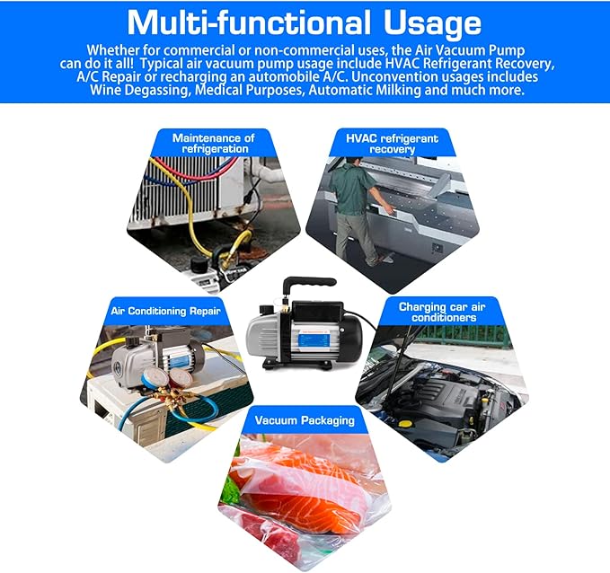 - 【Multi-functional Usage】AC Vacuum pump Kit, Single Stage Rotary Vane Air Vacuum Pump and AC Gauge Set for HVAC Air Conditioning Refrigeration Recharging. Typical air vacuum pump usage include HVAC Refrigerant Recovery, A/C Repair or recharging an automobile A/C. Unconvention usages includes Wine Degassing, Medical Purposes, Automatic Milking and much more.AC Vacuum Pump maintains air conditioning systems by efficient removing moisture before refilling the refrigerant.