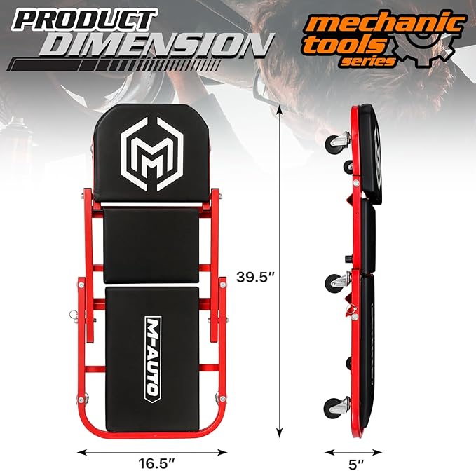 M-AUTO 40-Inch Folding Creeper Rolling Seat, All-in-One Adjustable Roller Garage Chair, Lay Down or Sit, 330LBS Capacity Under Car Roller Creeper with 6 Swivel Casters, Red