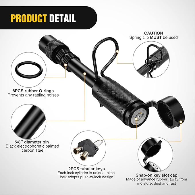 - SPRING CLIP AND Rubber O rings: A separate spring clip (cotter pin) provides additional safety, can use the locking pin with or without the lock mechanism. R spring clip (cotter pin) MUST be inserted into pin hole when use this lock. Rubber O rings prevent any rattling and hold the hitch pin still