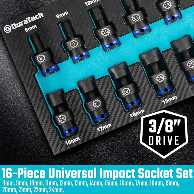 DURATECH 3/8" Drive Impact Universal Joint Socket Set, Swivel Socket Set, 16-Piece, Metric, 8-24MM, Cr-Mo Steel, Organized in EVA Foam Organizer