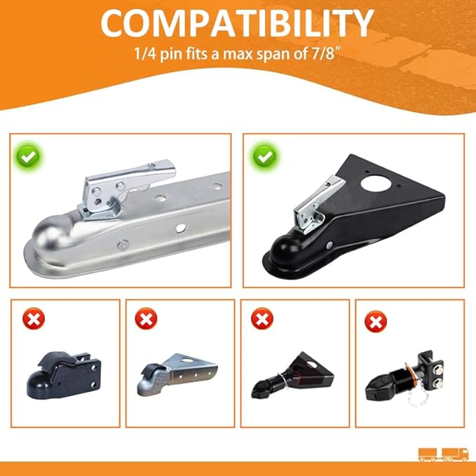 - 【PACKAGE INCLUDES】- This trailer coupler lock comes with 2x lock pin (1/4" diameter ) , 2x lock head (360°rotating design& water proof rubber cap), 4x copper keys (one for standby). NOTE: Please check the second image on the details page to see if it meets your needs.
