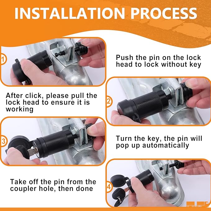 - 【PUSH-TO-LOCK DESIGN】- Upgraded trailer coupler lock is designed for easy operation. With the push-to-lock design, you can easily push to lock it without using key. Just turn the key a little bit and the pin will pop out by itself.
