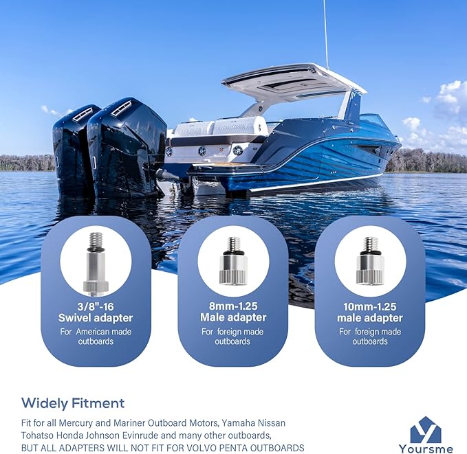 - 3/8"‑16 Swivel adapter fits for all Mercury and Mariner Outboard Motors and other American made outboards.