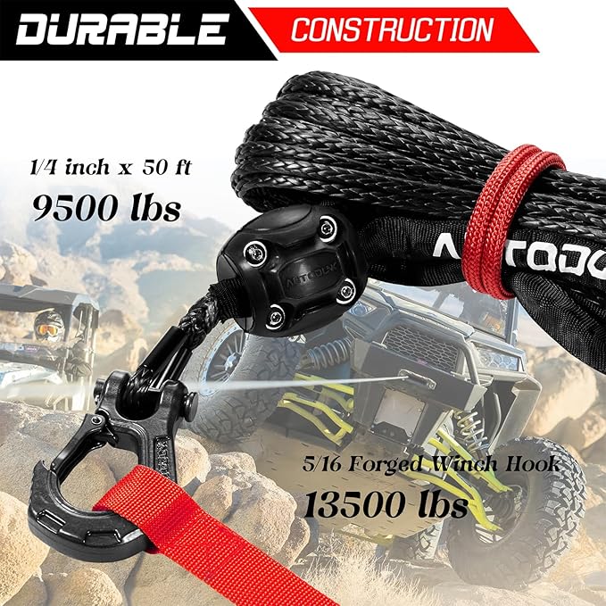 - Winch Rope Kit: Made of 12 strands braided ultra tough nylon. The 1/4-inch × 50ft synthetic winch rope has a maximum breaking strength of 10,000 lbs.