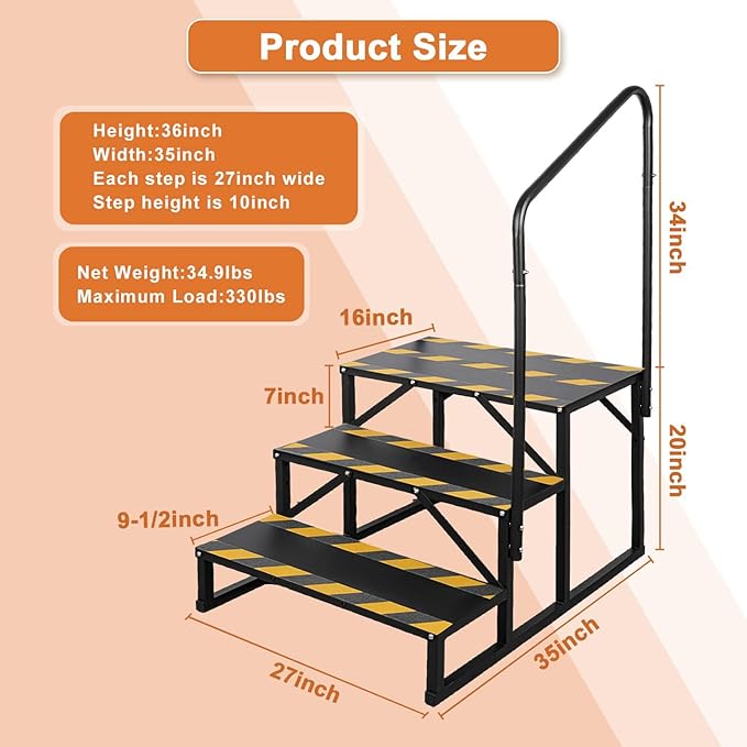 - 「SIZE AND UPGRADED PACKAGING METHOD」- This 3 step stair with total height: 20". Top platform dimensions: 27" x 16". Stair dimensions: 9.5" x 27". Stair rise increments: 7". Handrail height from platform: 34".Our upgraded packaging method features three layers of cardboard folding protection around the corners of the box, minimizing the risk of damage during transit. Each component is meticulously wrapped in protective film to ensure you receive your product in pristine condition, ready to use.