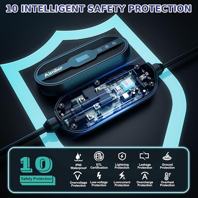- ❤ [Nema Type 4 Protection Degree & 25ft Long Bold Cable]: Approved by NEMA Type 4, the Aimiler ev charger has a certain extent of IP66 waterproof. (We don't suggest install in the direct sunlight or exposure rainy day.) Equipped with 25 feet military grade charging cable, the drop-resistant plug endures over 10,000 charges, super durable.