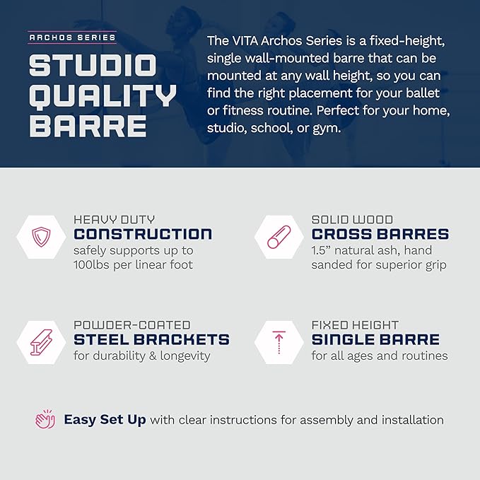 - A Studio-Worthy Barre – This Archos Wall-Mounted Barre features a Single, Fixed height 40-ft bar, 1.5" diameter. The bar is sleek, durable, and is held by heavy-duty powder-coated steel brackets. Each linear foot supports 100 lbs and at least 2’ should be allowed per person.