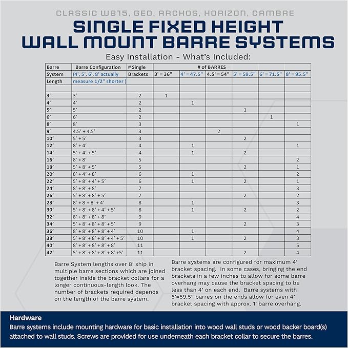 - Quick & Easy Installation – All hardware is included for easy setup: four 8' bars, nine steel brackets, and screws to attach the bar and mount to the wall. Standard barre height is 42” for dance and 36-40” for fitness, but you can install it at any height that works for you. Create a double system by mounting two bars at 32” and 42” for even more workout options.