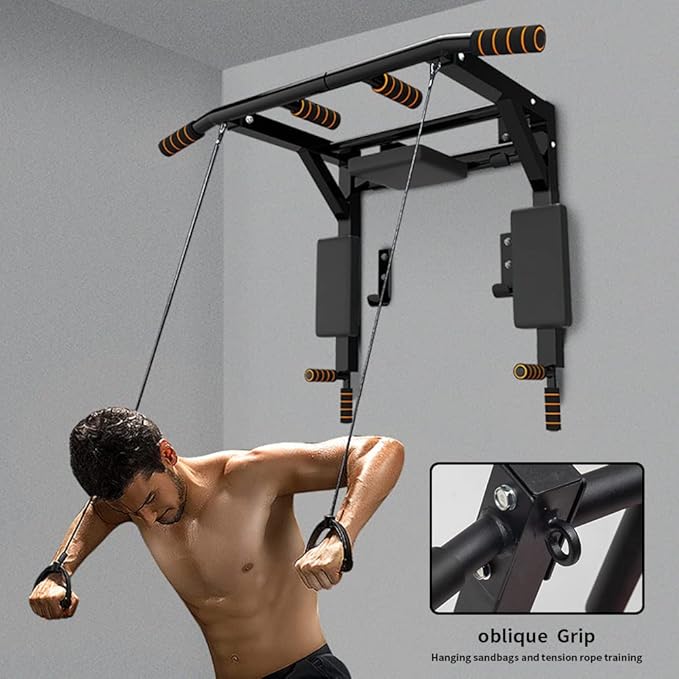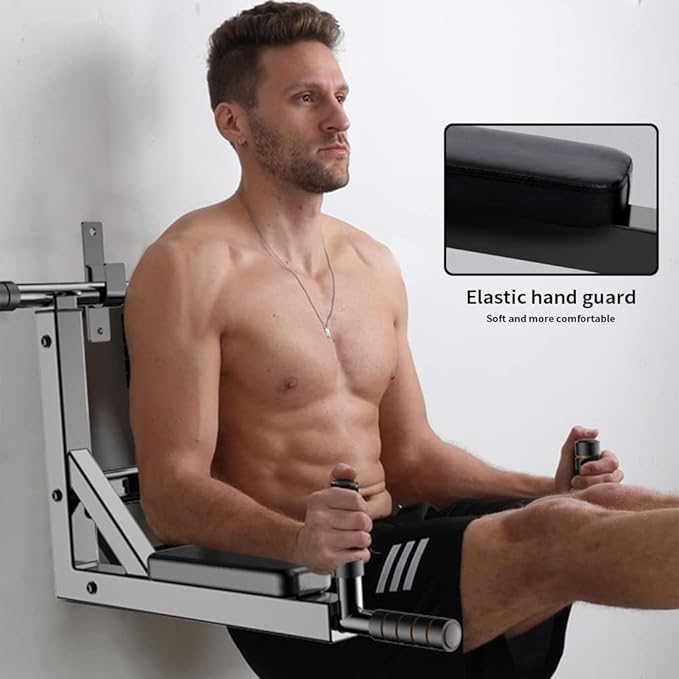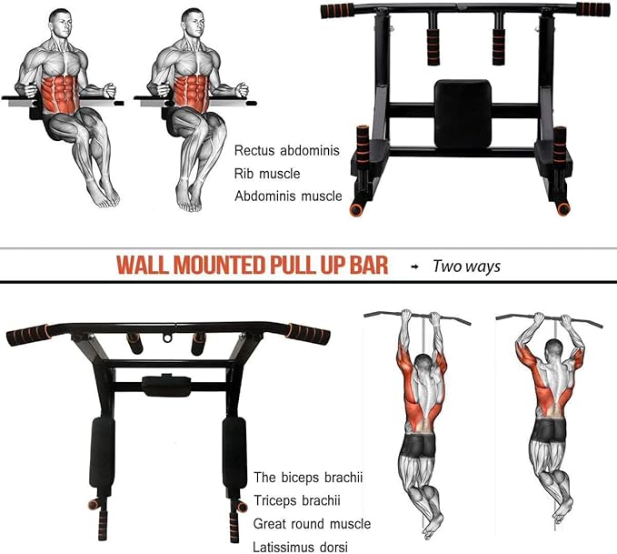 - 2 in 1 Equipment: Not only a wall mounted pull-up bar ,but also a dip station. You can do many exercise like pull ups,chin ups,dip station,leg raises and boxing. Perfect for exercising your backs,shoulder,chest,arms,triceps,biceps,lats,and the front of your abs and provide comfort