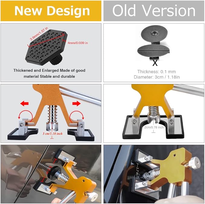 - Professional Dent Lifter: This upgraded dent puller kit special in adjustable the width and height with the golden dent lifter, and it is not only for small pits but also for repairing large dent. Made of high-carbon stainless steel and standard stainless steel. in the parts of the body contact with high-quality rubber precision package, can avoid damage to the original paint