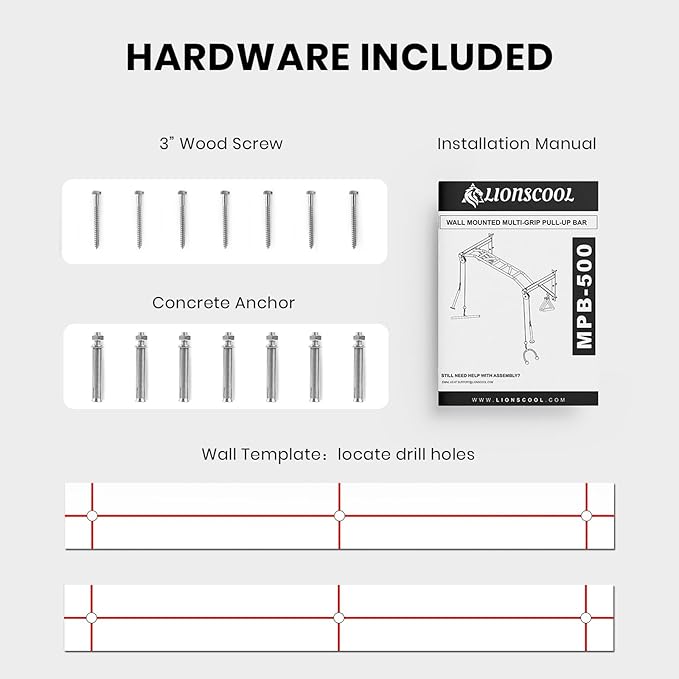 - WALL MOUNTING REQUIREMENTS: We recommend mounting the LIONSCOOL pull-up bar on a cement wall or solid brick wall. If you plan to install it on drywall, you'll need to add additional wooden boards for support to prevent cracking. The installation is straightforward and convenient. The package includes all the necessary installation components. We provide detailed instructions and a pair of wall templates to assist you in locating and measuring the proper span (48" apart) before drilling holes.