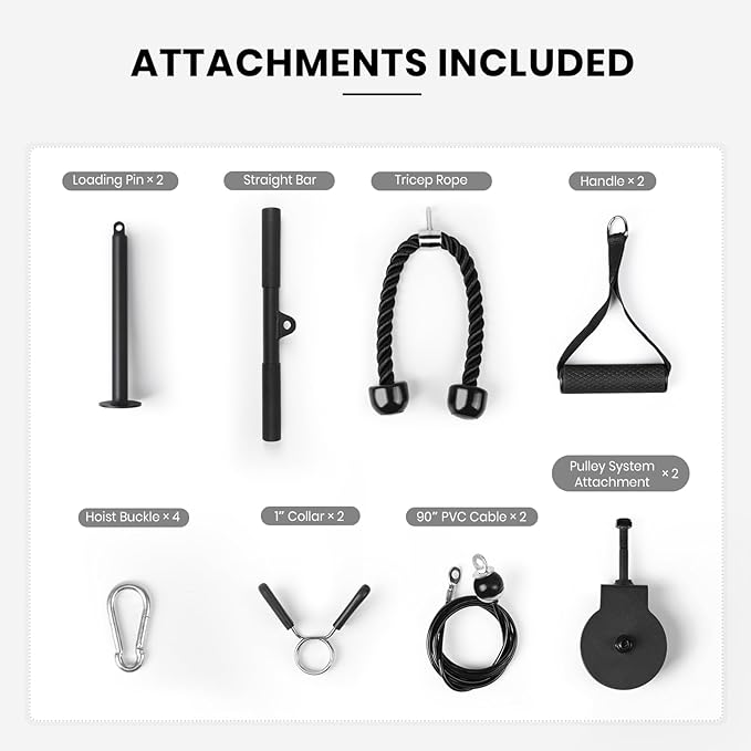 - YOUR GO-TO EQUIPMENT: The LIONSCOOL Multi-Grip Pull-Up Bar with Pulley System is your go-to equipment for building upper body strength. The pulley system combines two swivel pulleys with two PVC encased cables, two 1” loading pins with 11” of loadable length, a straight bar, a tricep rope, and 2 cable handles. With a built-in pulley system, you can target muscles throughout your body and explore creative ways to enhance your fitness routine.