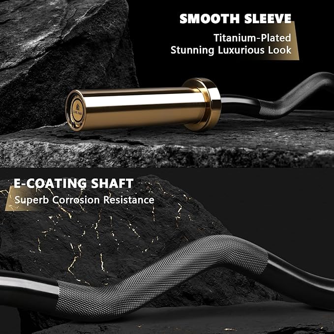 - Titanium-Plated Sleeves: Beyond its enchanting aesthetics, our curl bar delivers exceptional performance. The titanium-plated sleeves provides outstanding durability and rust resistance. This ensures that the bar maintains its stunning appearance even with rigorous use, making it a reliable companion for your fitness journey. Moreover, unlike grooved sleeves that makes a zip noise when loading plates, the sleeves on this bar are very smooth, providing an easy and quiet plate loading.