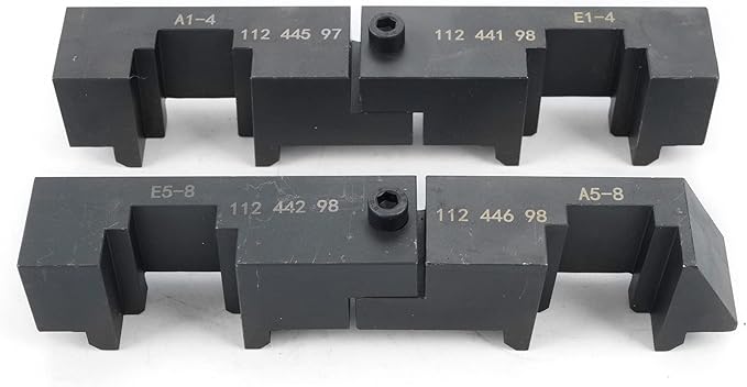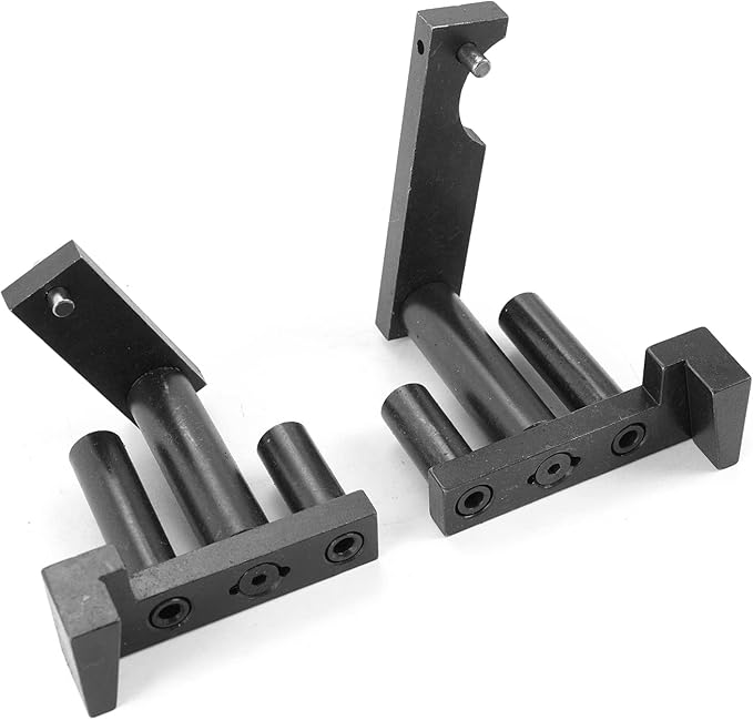 - Two Camshaft alignment jigs secure both camshafts in correct positions for engine assembly. Top dead center pin accurately aligns the engine flywheel at its designated TDC mark. A rigid chain tensioner applies precise tension to the engine's primary timing chain. Camshaft timing tools lock the sensor wheels securely during cam timing procedures. The chain tensioning bracket trestle provides a stable mount for the tensioner with the timing cover removed