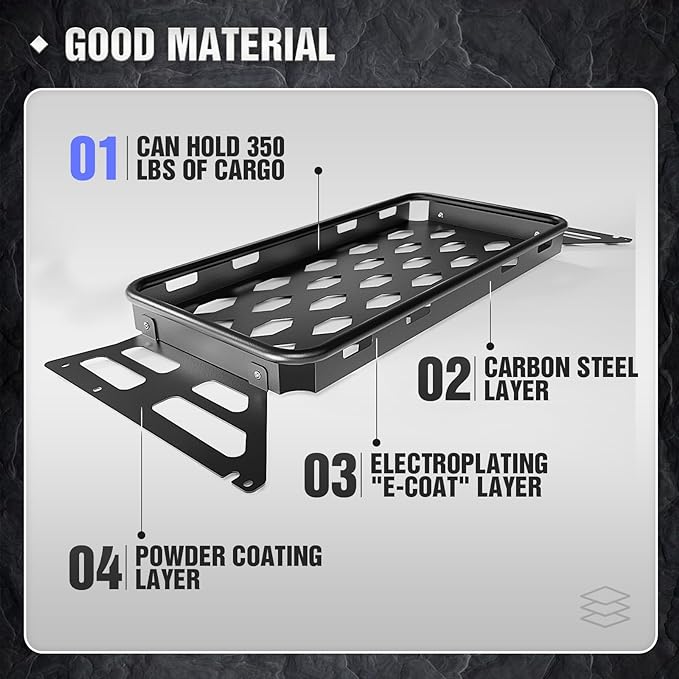 - 【Sturdy and Durable】: Constructed with high-strength steel, precision laser-measured and cut to ensure a proper fit. The cargo rack is made with corrosion-resistant coating and high-quality electronic coating for enhanced rust protection. With a corrosion-resistant process lasting up to 8 years under normal usage, it exhibits exceptional durability and longevity.