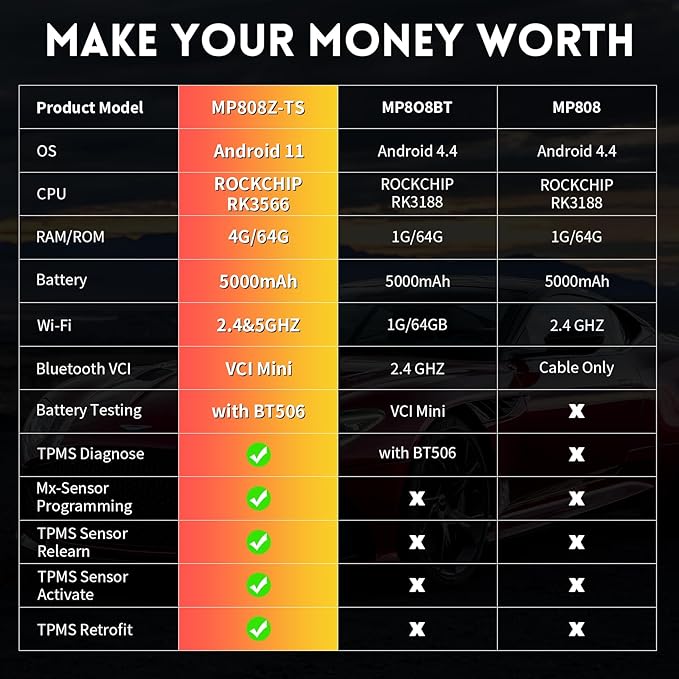 - 【Version Autel MP808Z-TS TPMS Diagnostic Scanner】Based on MP808TS, Autel MP808Z-TS enhanced running & response speed by 3 times with better hardware: Android 11 OS, 2.4 & 5.0 GHZ Dual WiFi, Expanded Storage:4GB/64GB, ROCKCHIP RK3566 Processor, & 2.4/5.0GHZ Dual Wi-Fi. Equal to MS906BT plus TS608, Alll New Functions are accessible out of box with no need extra Updates: ECU Coding, Full TPMS, Active Test, 28+ service, special functions, FCA Auto Auth, Compatible with Autel BT506 battery tester/ MV108.