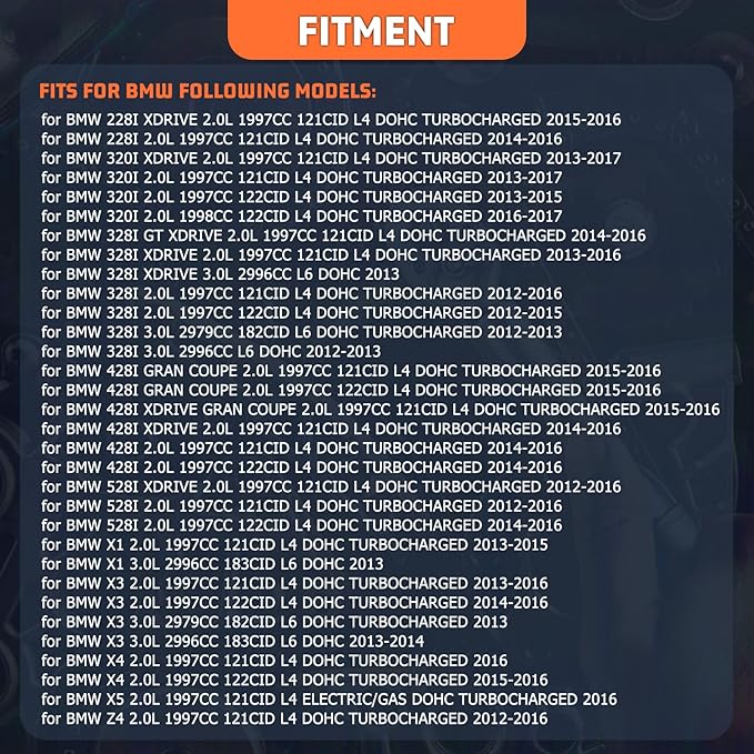 - 【VEHICLE APPLICABLE】Fit for BMW 228I XDRIVE 2.0L 2015-2016; for BMW 228I 2.0L 2014-2016; for BMW 320I XDRIVE 2.0L 2013-2017; for BMW 320I 2.0L 2013-2017; for BMW 320I 2.0L 2013-2015; for BMW 320I 2.0L 2016-2017; for BMW 328I GT XDRIVE 2.0L 2014-2016; for BMW 328I XDRIVE 2.0L 2013-2016; for BMW 328I XDRIVE 3.0L 2013.【More compatible models in the description】