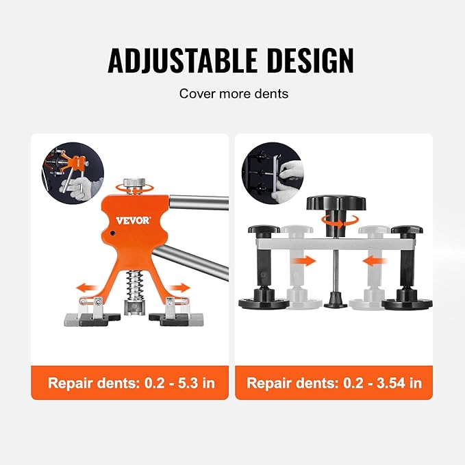 - Paintless Dent Repair Tool Kit: Our gold dent lifter, bridge dent puller, stainless steel 2-in-1 slide hammer have been upgraded with high quality. The gold dent lifter can adjust the bottom width to accommodate different dent sizes from 0.2" to 5.3". The adjustable bridge dent puller can repair dents from 0.2" to 3.54". And the stainless steel 2-in-1 slide hammer can be easily converted to a short or long puller with ease. Bringing you a new experience in dent repair.