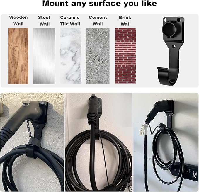- Improve Organization: The wall-mounted charger holder features a simple and practical J hook structure to keep the plug dust-free and ensure your garage space stays organized. Most importantly, it reduces the risk of tripping and prevents your electric car from running over the charging cable