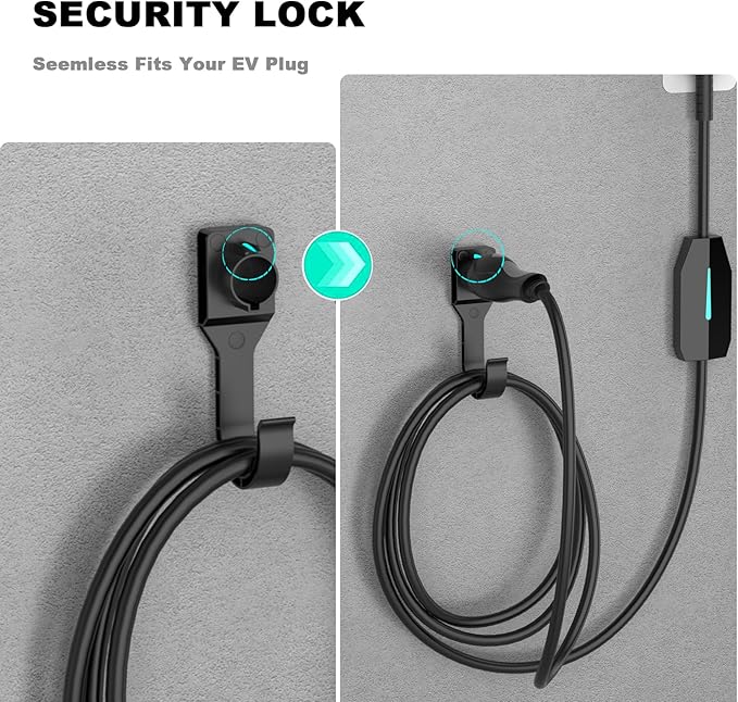 - Secure Lock Design: H3JANG EV charger cable holder for SAE 1772 features a secure lock design that sets it apart from others. The built-in locking function protects EV charger from accidental falls, ensuring the safety of both your charging equipment and vehicle. This added security provides peace of mind every time you plug in