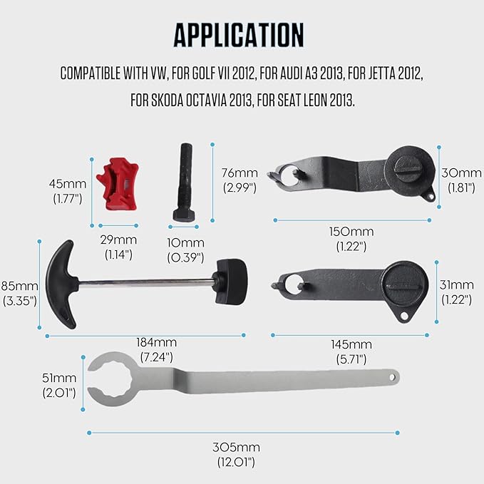- 【Wide Application】: Compatible with VW Golf VII 2012, for Audi A3 2013, for Jetta 2012, for Skoda Octavia 2013, for Seat Leon 2013. One set of timing tools help to the replacement of timing belts for multiple models.