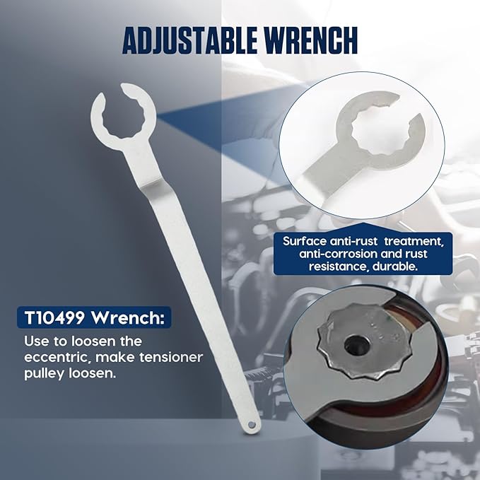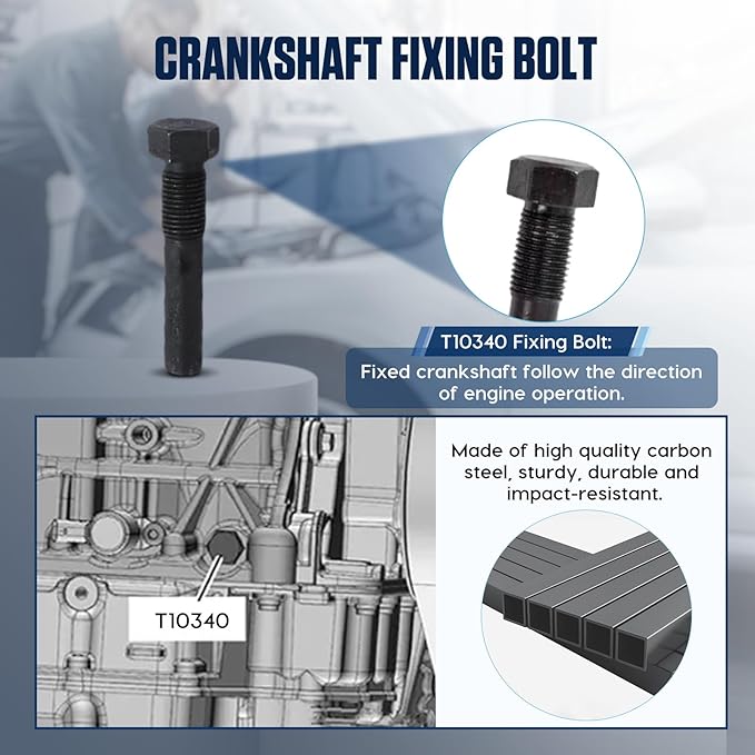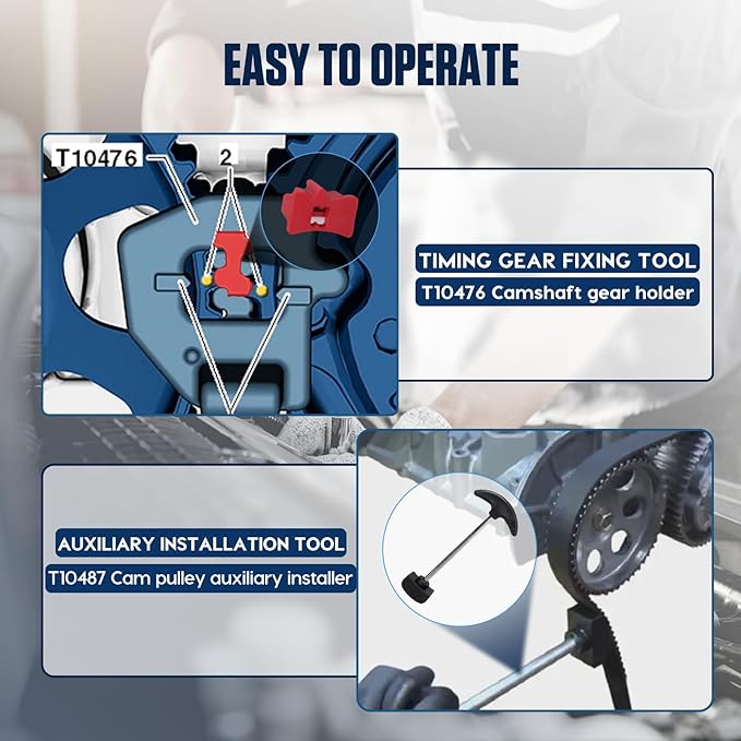 - 【Convenient to Carry】: The camshaft alignment parts equipped with a blue tool box, easy to carry and store, to prevent tools from being lost or not found.The camshaft timing tool kit contains 6 useful tools: T10477 Camshaft Holder, T10494 Camshaft Holder, T10476 Camshaft Gear Holder, T10487 Belt Holder, T10499 Wrench, T10340 Crankshaft Positioning Pin, ready access upon use.