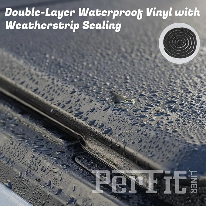 - Superior Material: The Tonneau Cover is crafted from a double-layer PVC material. It features high-quality vinyl that is waterproof, dust-resistant, and UV-resistant. Additionally, it comes equipped with side rails, a seal strip, and stainless steel clamps for secure mounting to the truck bed