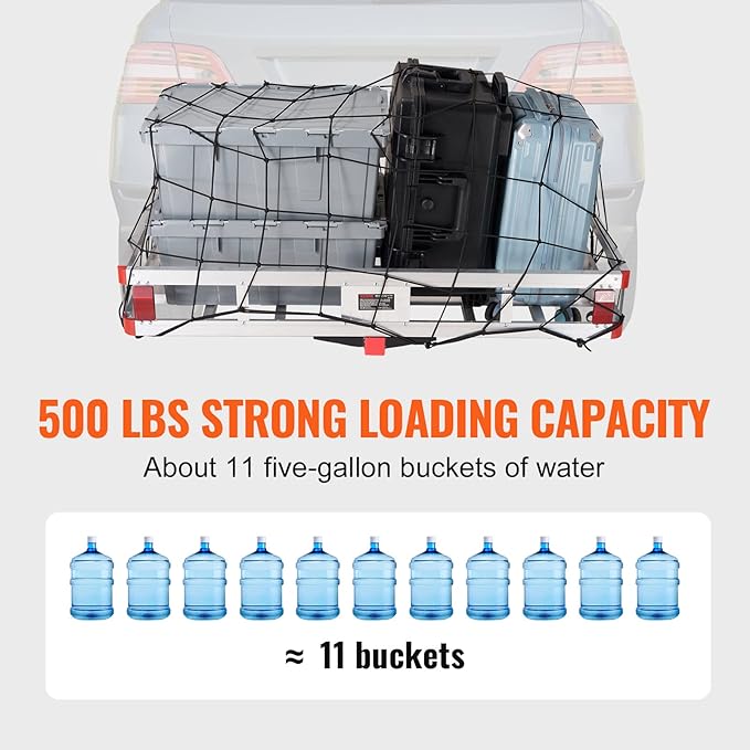 - Robust Aluminum Construction: VEVOR 49.4 x 22.4 x 7.1 inch quality rustproof aluminum hitch cargo carrier can support up to 500lbs of cargo, gear, or equipment. Lightweight aluminum make the frame easy to install.