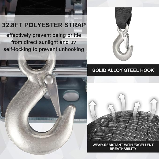 - Versatile and Durable: The towing winches are designed for pickup trucks, trailers, and towing boats, loading boats, trucks, ATV, UTV, Jet Ski, etc. Their sturdy construction ensures durability and reliability, even in tough weather conditions.