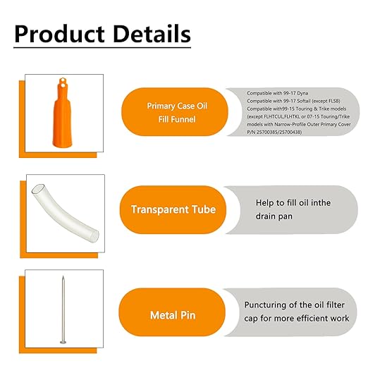- Primary Case Oil Funnel: Prevent spills when changing your oil filter with this funnel, which fits snugly under the filter for easy access. Compatible with various Evolution 1340, Dyna, Softail (except FLSB), Touring, and Trike models.