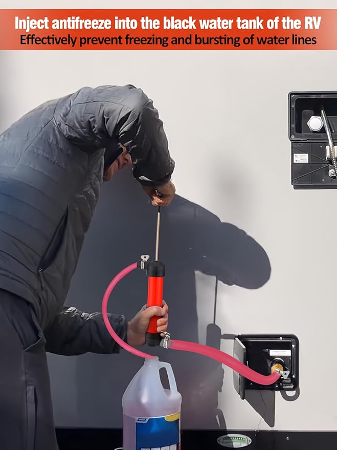 - Easy to Use: Connect the narrow hose to the pump and secure it with clamps. Attach the wide hose to the RV black water spray pump, then operate the pump manually to move antifreeze into the tank. Hoses can be trimmed to the needed length. Clear instructions are included for simple and quick operation