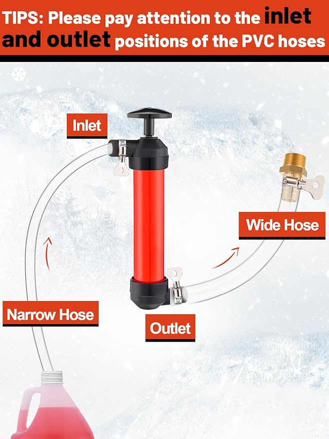 - Package Contents: You will receive an antifreeze hand pump kit, including a red pump, a 3/4" NPT brass connector, a 39.4" narrow hose, a 23.6" wide hose, and 3 clamps. With this kit, you can easily inject antifreeze into RV tanks or water systems to prevent freezing and extend service life