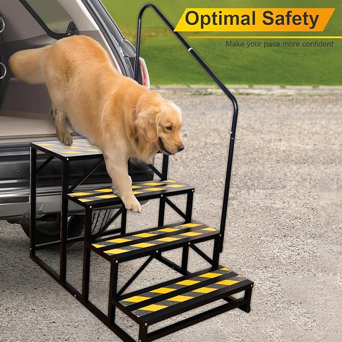 - Robust and Long-lasting Construction: Crafted from heavy-gauge alloy steel and finished with a durable black powder coating, our steps are built to withstand the rigors of regular use. We've reinforced the structure with an upgraded triangle lever, significantly enhancing stability and safety compared to conventional ladders. With a weight capacity of up to 400 pounds, these steps can accommodate two adults and even pets with ease.