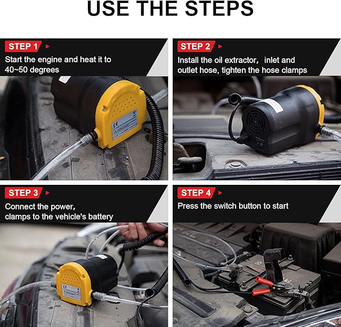 - Easy Operation: You just need to place the inlet/outlet hoses at the appropriate positions, tighten the hose clamps, connect the power clamps anode and cathode to the car battery properly and press the button. The oil extractor pump will self exporting oil
