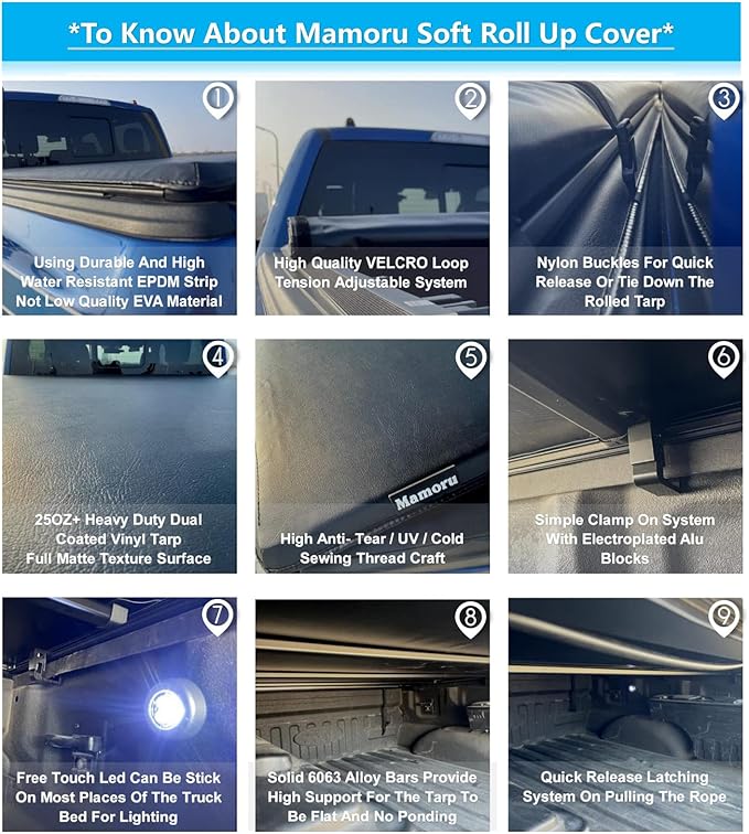 - Packing Inventory: Soft Roll Up Dual Coated Vinyl Tonneau Cover,Full Set of Installation Kits And Instruction Manual,1pcs Free Touch Button Led Light;
