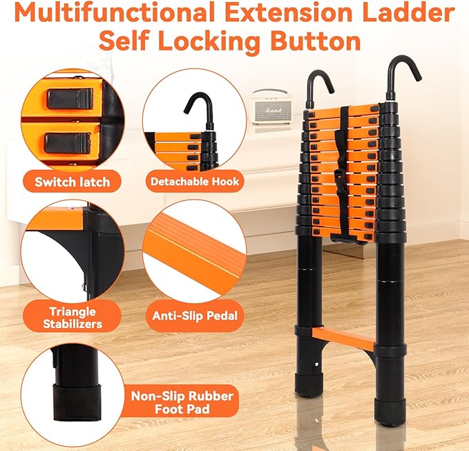 - đăăPortable & Stable Retractable Ladderă The lightweight telescopic ladder with comfortable tie-down ropes and handles can be easily moved to any position to save energy. The telescopic ladder with padded feet and triangular stabilizing design is more stable and less wobbly during use. Simply push the switch and pull out the hooks to remove and install.