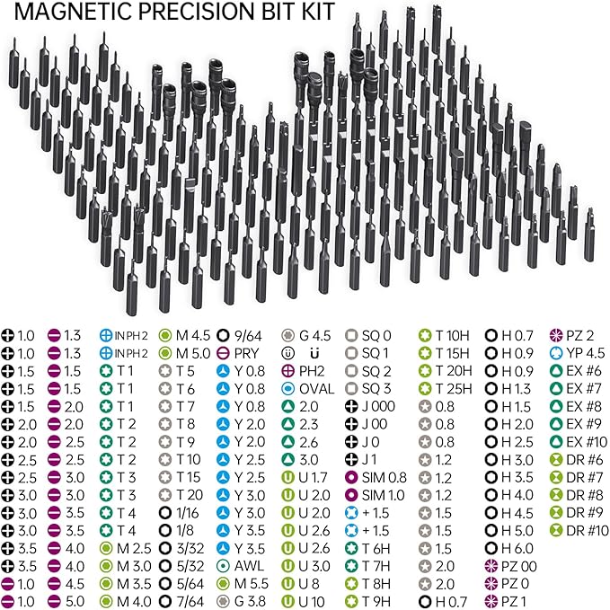- 【MAGNETIC MULTI SCREWDRIVER SET】 160Pcs magnetic precision screwdriver bit are included in torx star screwdrivers set made of chrome-vanadium tool steel (HRC52) phosphating surface,torx screwdriver set exquisite craft,high hardness,magnetic,precision without damaging devices.Magnetic precision bit kit come with Phillips, Flathead, Torx, Torx Security, Hex, Star, Socket, Gamebit, Tri-Wing, Tri-Angle, U-shape, Square, Pozidriv, Standoff, JIS, Drill, Extractor, PH2, In PH2, PRY, AWL, OVAL.