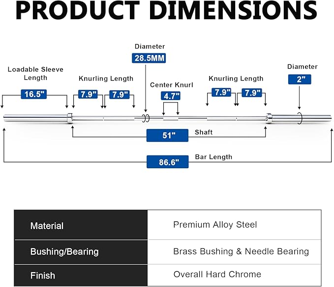 - Pro-Grade Specs: 86.6” length, 20 kg (~44 lb) weight. 28.5mm grip diameter, 51” shaft, and 16.5” sleeves compatible with all Olympic weight plates.