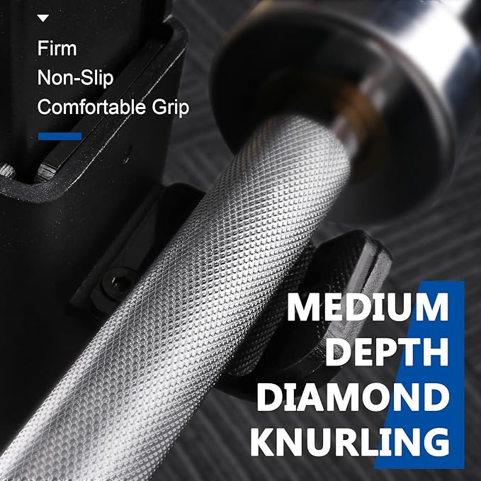 - Optimal Grip & Control: 1.5mm medium-depth diamond knurling with flattened top for a secure and non-slip grip while not being too aggressive. Features a 4.7” center knurl to grip your back during squats.