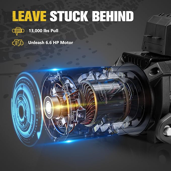 - Remarkable Pulling Power: With a 6.6HP motor and 3-stage planetary gear train boasting 195.8:1 ratio, Bunker Indust 12V electric winch effortlessly manages tasks, pulling up to 13,000lbs with ease. The synthetic rope of our 12V electric winch boasts 14,656lbs breaking strength, refusing to fray or snap during every operation of our synthetic rope winch. It includes a temperature-resistant sleeve for extra protection.