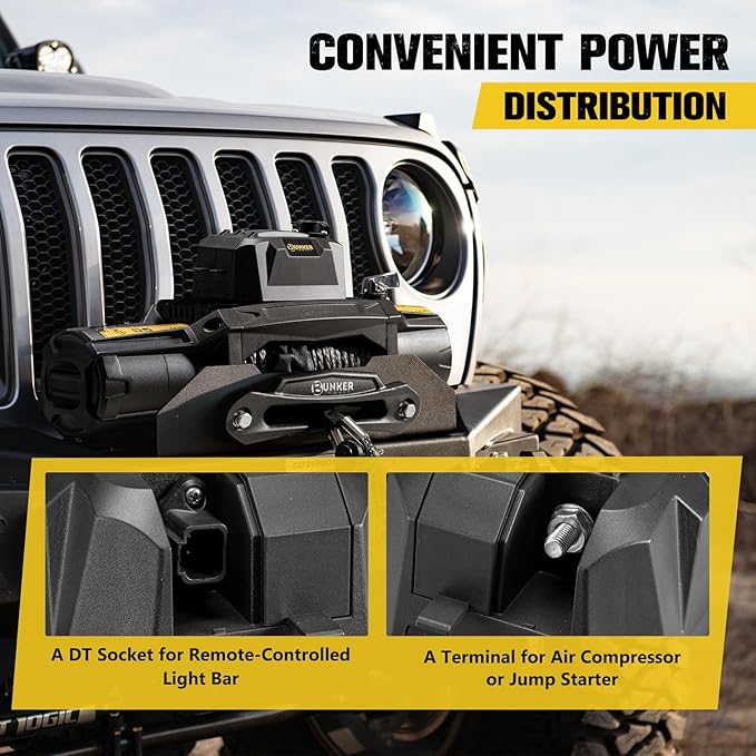BUNKER INDUST 13000lb Electric Winch 12V Waterproof with Synthetic Rope Fairlead for Truck SUV,DT Socket and a Terminal in Control Box Ready for Added Appliances,Wire and Wireless Remote Control