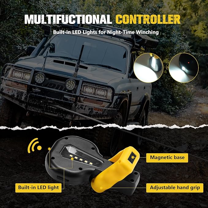 - Versatile Controller: The wireless controller integrates LED lights for night-time winching. The magnetic base and adjustable hand grip make it a handy work light. The free spooling clutch on our12V electric winch enables swift rope payout from our 12V electric winch.