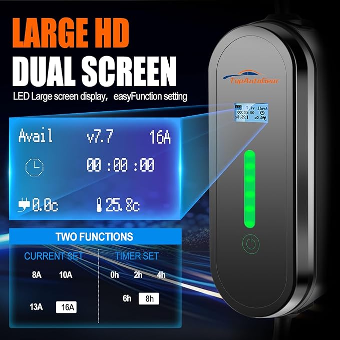 - 【INTELLIGENT LCD DISPLAY】: Equipped with an intelligent LCD display screen, the TopAutoGear ev charger provides a clear visual representation of the charging status, five-level current selection, and time scheduled charging settings. Easily understand the charging process and make adjustments as needed.
