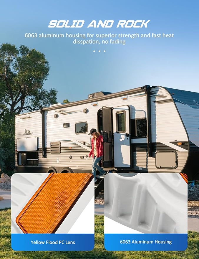 - 800LM PER LIGHT : The spread irradiation range of RV exterior light are 65 degree in horizontal spread X 69 degree in vertical to avoid falling and injury in the visual blind area, farewell to the darkness