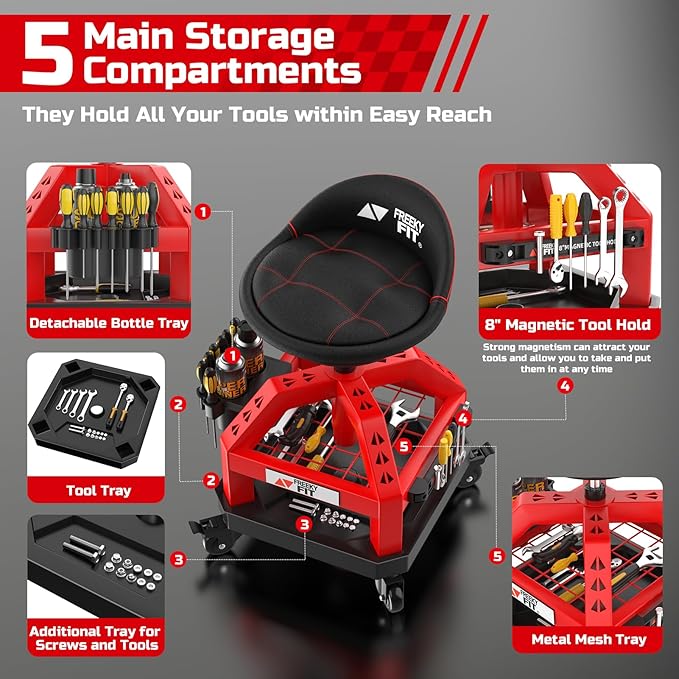 Rolling Shop Stool for Garage with Casters, DO02-Adjustable Height 360° Swivel Shop Seat with Tool Tray Storage, 330 LBS Capacity Padded Mechanic Stool, Magnetic Tool Hold, Heavy Duty, Red