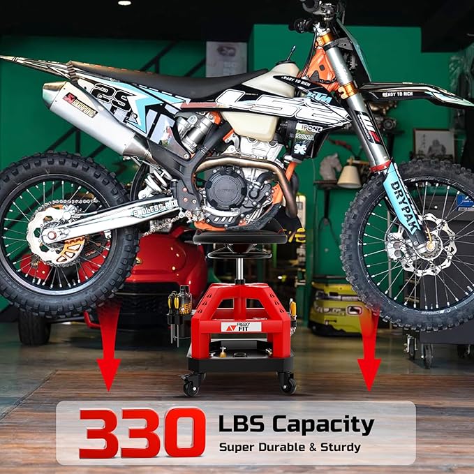 - Heavy-duty Mechanic Stool: 24 Pounds Item Weight Heavy Duty for Garage Work. This Mechanic Stool is specially designed with a thick angle steel frame, ensuring long-lasting performance and reliability. Its design can withstand heavy use, with an overall weight capacity of around 330 pounds. It is a sturdy and practical choice for use in garages ,workshops & any other heavy duty work place