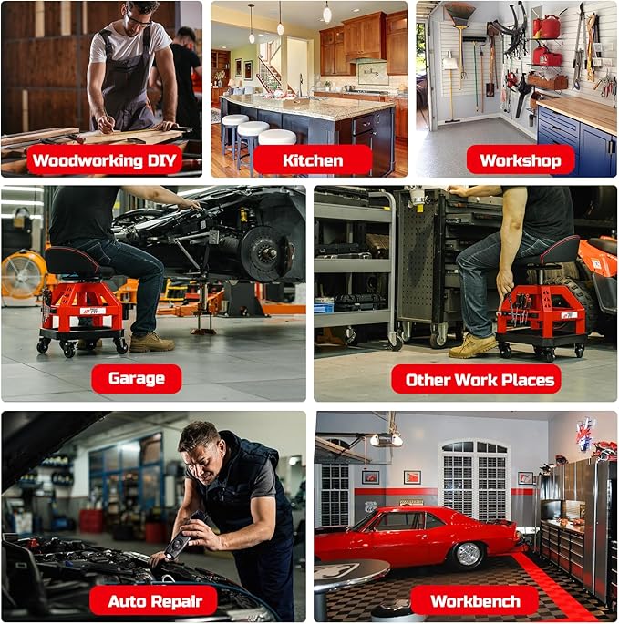 - Engineering Design & High-Storage: Our Rolling Seat with square tube and steel ring structure provides space for resting the feet, and the design of this automotive repair chair includes two tool trays located under the seat. The first layer is a metal mesh tray, and the second layer is a solid plastic tray, making it convenient to store and access necessary tools and parts. In addition, we are also equipped with utility tool rack. It helps to keep the work area tidy and reduces the need for frequent tool movement