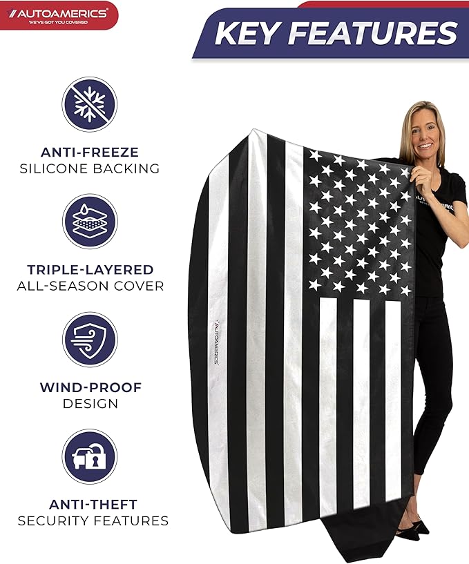 - Market-Leading All-Season Protection in B&W USA Flag Style: Our heavy-duty windshield cover is designed to prevent unwanted ice & snow buildup on your front windshield so you will no longer need to scrape the ice away, saving you precious time and improving your visibility.