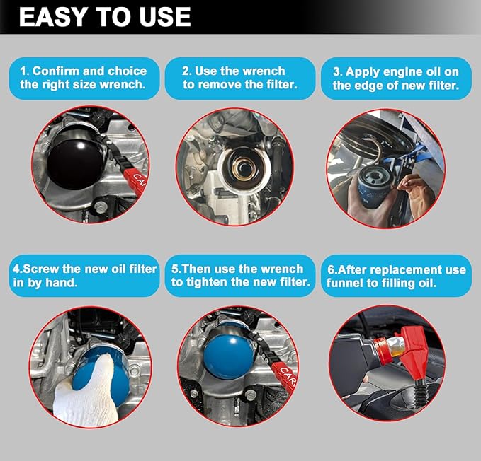 - Use Easily: Choose the suitable size wrench then clamp the oil filter to remove or install. After replacement, use the snap funnel to filling of engine oil which has wide neck and wide spout allow for quick filling of oil without spills.