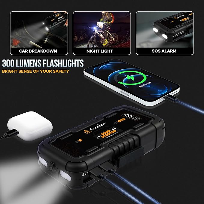 - 30x Confidence Jumps: EcoNour’s PulseBoost portable car jump starter delivers up to 30 jump starts per charge. This compact yet powerful battery jumper starter portable handles gas engines up to 7L and diesel engines up to 5L. Perfect as a car battery jump starter for 12V vehicles like motorcycles, SUVs, pickups, lawnmowers, and more — a must-have jump box for emergencies.